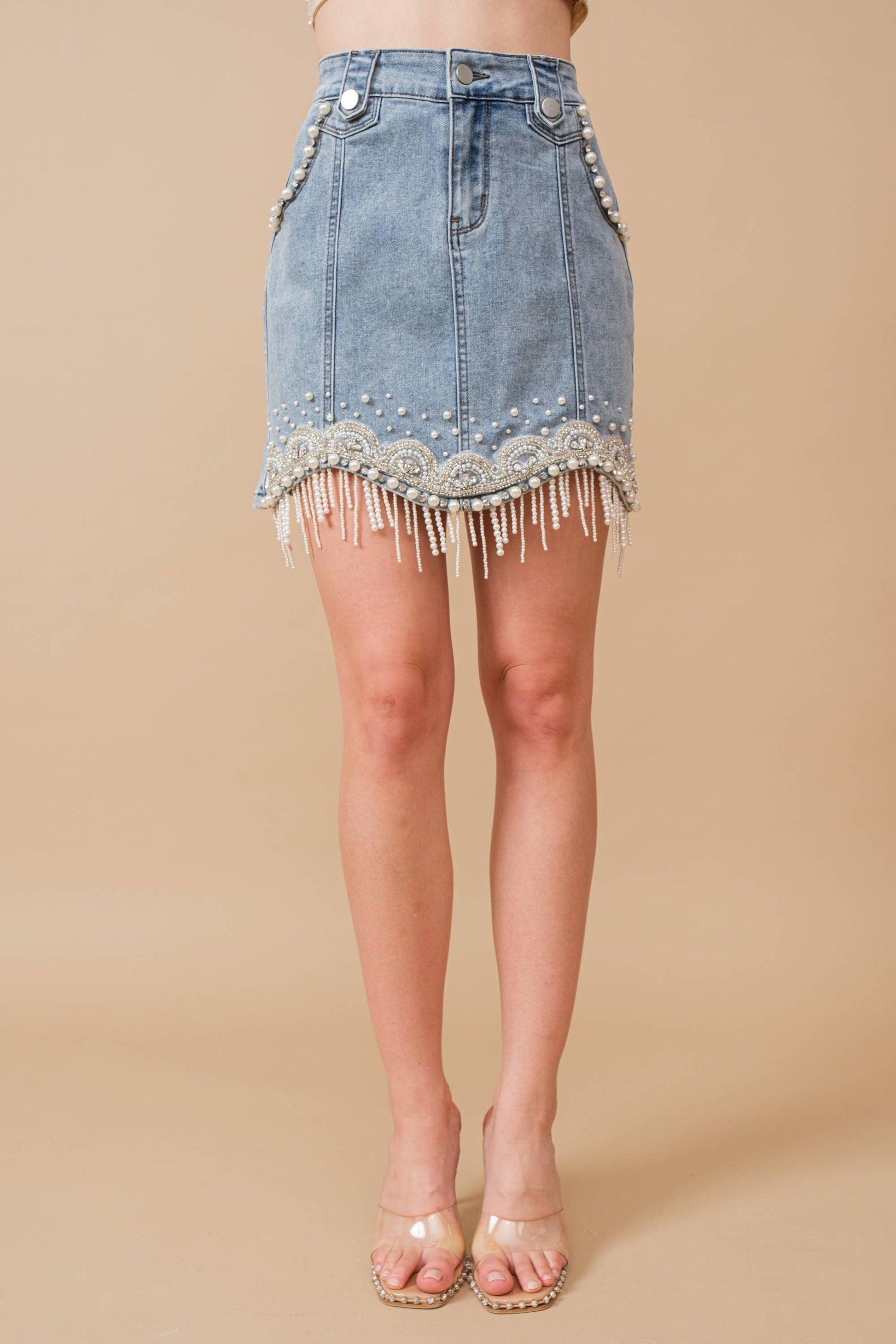 Stretch Denim Embellished Pearl Fringe Mini Skirt